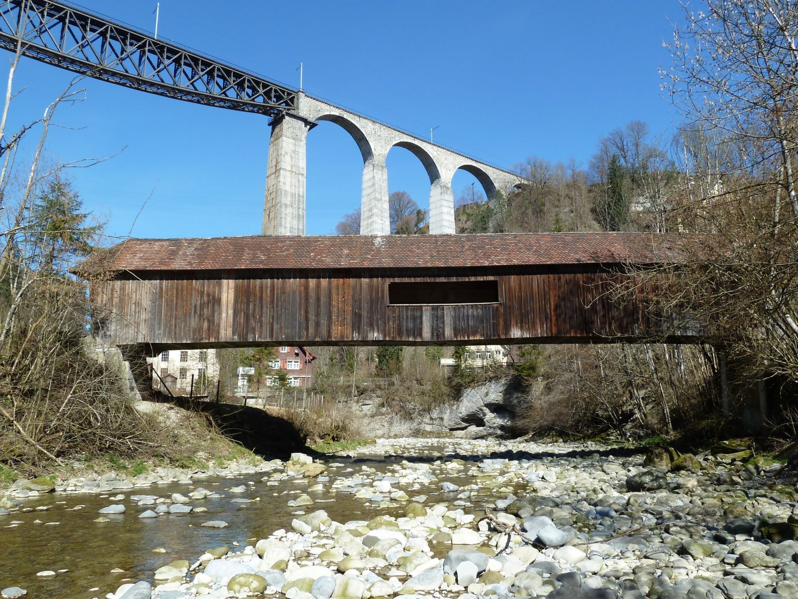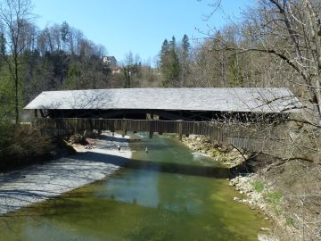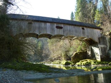 Gedeckte Sitterbrücke Zweibruggen, 1787Die einfeldrige, mit einem Walmdach gedeckte Holzbrücke hat ein polygonales Hängewerk