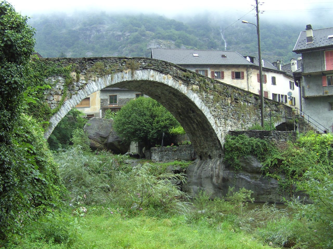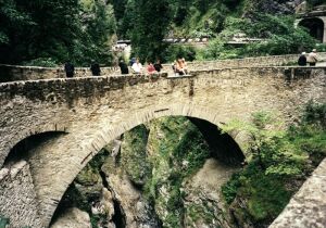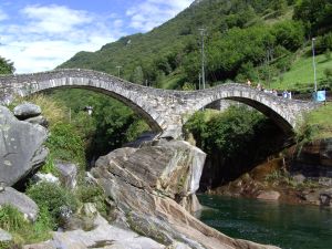 Ponte dei Salti im VerzascatalDie mittelalterliche Brücke besteht aus zwei hohen Steinbogen mit starker Kuppenausrundung. Sonderseite der Brücke |