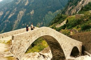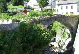 Saumpfadbrücke in HospentalNeben der Brücke für die Kantonsstraße steht in Hospental noch die alte Saumpfadbrücke über die Gotthard-Reuss. |