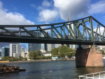 Eiserner Steg, Frankfurt am Main, 1945-1946Die Fußgängerbrücke über den Main hat ein vernietetes Eisenfachwerk über drei Felder, bei dem