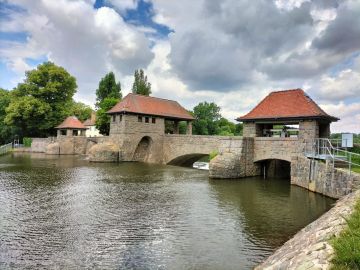 Palmgartenwehr, Leipzig, 1912-1915Die Wehrbrücke hat vier massive Bogen. Auf ihr stehen drei mit Walmdächern gedeckte
