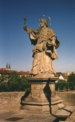 Der heilige NepomukDer um 1350 in Pomuk geborene (ne Pomuk) Johannes war zunächst Notar in der erzbischöflichen Gerichts-Kanzlei in Prag und später Domherr und Generalvikar des Erzbischofs in Prag. 1389 wurde er Generalvikar der Diözese Prag. Er war beim Volk sehr beliebt, da er in seinen Predigten konsequent für die Rechte der Kirche gegenüber dem jähzornigen und trunksüchtigen König eintrat.Johannes wurde in den Auseinandersetzungen zwischen König Wenzel und dem Prager Erzbischof Jenzenstein 1393 gefangen genommen. König Wenzel beteiligte sich persönlich an seiner Folterung und ließ ihn durch die Straßen schleifen und danach von der Karlsbrücke aus in der Moldau ertränken. Nach der Überlieferung war Johannes der Beichtvater der Königin und Wenzel ließ ihn töten, weil er sich weigerte, das Beichtgeheimnis zu brechen. Johannes' Leichnam wurde im Veitsdom in Prag bestattet und er wurde schon bald als Märtyrer verehrt. Bei einer 1719 durchgeführten Graböffnung fand man Gebeine und Zunge unversehrt. Seit der Errichtung seines Denkmals auf der Prager Karlsbrücke im Jahr 1693 und schon vor seiner Heiligsprechung im Jahr 1729 wurde er zum Brückenheiligen schlechthin. Er wird fast immer mit einem Kruzifix oder einer Märtyrerpalme und einem Kranz von 5 Sternen dargestellt. Diese umstrahlten den Leichnam bei der Auffindung und werden oft als die 5 Buchstaben des lateinischen Wortes TACUI "ich habe geschwiegen" gedeutet. Häufig hält er auch den Finger an den Mund. Standbild auf der Alten Mainbrücke in Würzburg |