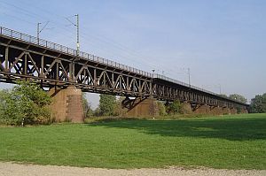 Die Eisenbahnbrücke über den Rhein bei Worms erforderte auf der rechtsrheinischen Seite eine 589 m lange Flutbrücke.