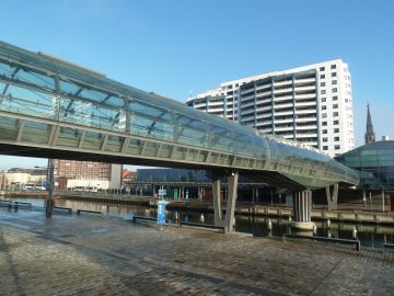 In Bremerhaven führt die gedeckte Brücke über ein Hafenbecken und wurde daher als Drehbrücke ausgebildet. |