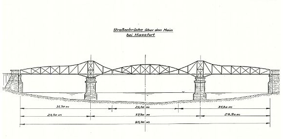 Zeichnung: Erich HermesGerber wandte diese Konstruktion erstmals 1864 beim Bau der dreifeldrigen Mainbrücke in Hassfurt an. Der Einhängeträger war 23,1 m lang. | |