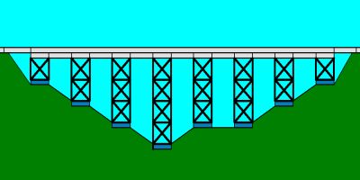 Im Gegensatz zu Trestlebrücken ist eine Abfolge von Pfeilern und Feldern erkennbar.  |