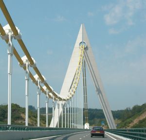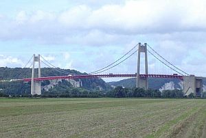 | In Europa übertraf 1969 die Brücke von Tancarville mit 608 m Spannweite erstmals den seit 70 Jahren gehaltenen Rekord von 521 m der Firth of Forth Bridge. Sie war eine der ersten Brücken mit Türmen aus Stahlbeton. | |