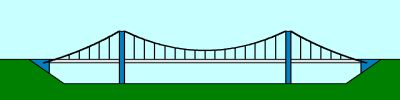 Standardform Im Gegensatz zu den anderen Brückenarten wird die weit überwiegende Anzahl von Hängebrücken in einer Standardbauform erstellt. Diese hat 2 Türme und somit eine Hauptöffnung und zwei Seitenöffnungen. Die Brückentafel ist über allen drei Öffnungen senkrecht von den 2 Tragkabeln abgespannt. |