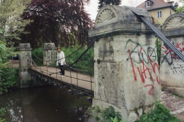 Als älteste erhaltene Hängebrücke Deutschlands gilt die 1833 errichtete Schaukelbrücke über die Ilm in Weimar. Sie hat Hängewerke aus 1,8 m langen Zugstäben, deren Ösen mit Laschen und Bolzen verbunden sind. |