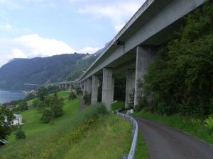 Der 1976-1980 erbaute 3147 m lange Lehnenvadukt am Südufer des Vierwaldstätter Sees ist die längste Brücke der Schweiz. Die getrennten Überbauten haben jeweils 58 Felder. |