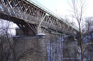 In Kempten wurde 1851 eine Eisenbahnbrücke über die Iller mit Spannweiten von 35 - 53 - 26 m errichtet. Die schon seit langer Zeit nur noch Fußgängern und Radfahrern dienende Brücke ist die letzte verbliebene Brücke dieser Bauart in Deutschland. Alte Illerbrücke Kempten |