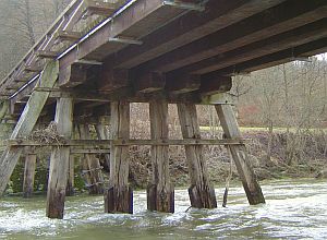 Die Pfahljochpfeiler werden in der Regel aus Balken aus Eichenholz zusammengesetzt. Neckarbrücke Neckarhausen |