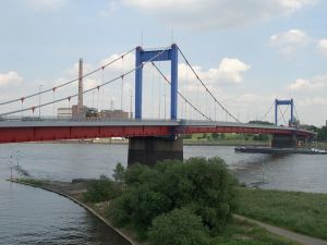 Die Friedrich-Ebert-Brücke in Duisburg war die letzte in Deutschland erbaute Zügelgurtbrücke. Sie wurde 1954 fertiggestellt und hat einen abgespannten Brückenteil von 542 m. Foto: Hermes  |