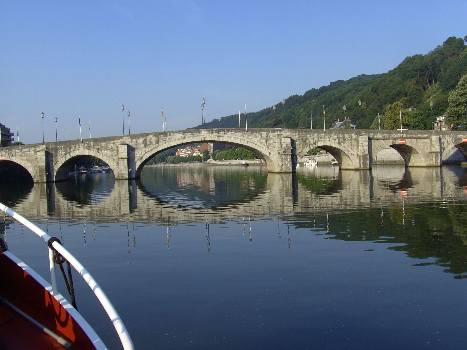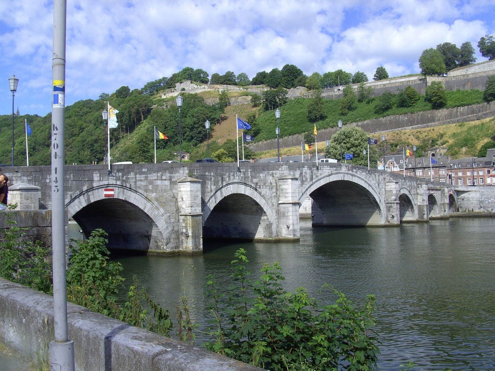 Größeres Bild 1600 x 1200 Eine Brücke über die Maas wurde erstmals im 13. Jahrhundert urkundlich erwähnt. In einem Verzeichnis aus dem Jahr 1289 war von einer Brücke aus Stein und Holz mit einem Turm in der Mitte die Rede. Im 14. Jahrhundert wird die Brücke mit mehreren Steinbögen und zwei hölzernen Tragwerken beschrieben. Über dem 7. Pfeiler erhob sich der Turm Beauregard, der die Grenze zwischen Namur und Jambes markierte und unter dem Streitfragen zwischen den Kommunen geklärt wurden. 1746 wurde die hölzern überspannten Joche durch zwei kleiner Steinbögen ersetzt. |