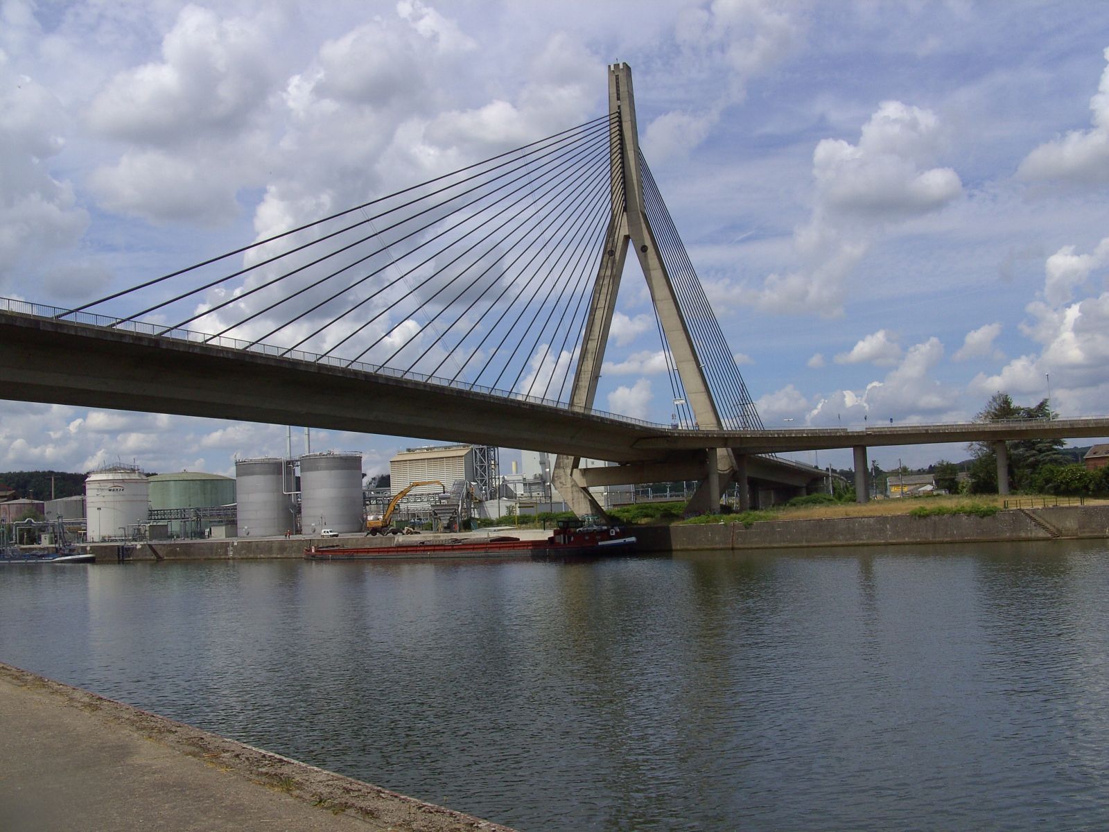 und der 296 m lange abgespannte Brückenteil, der parallel zur Maas erbaut wurde, in einer spektakulären