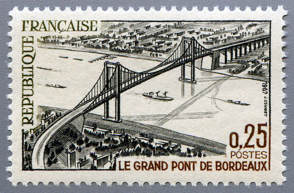 Größeres Bild 1600 x 1200 Der Fernverkehr von Paris nach Bordeaux führte seit 1822 über eine steinerne Brücke, die auf Napoleos Veranlassung erbaut wurde, über die Garonne. Diese Brücke war dem Verkehrsaufkommen schon seit langem nicht mehr gewachsen, weshalb eine weitere Brücke dringend erforderlich war. Geplant und ausgeführt wurde eine Hängebrücke, die im Norden von Bordeaux als Teil eines Autobahnrings über die Garonne führt. Nach einer Bauzeit von sieben Jahren und 144 Jahren nach Errichtung der ersten Garonne-Brücke konnte die zweitgrößte Hängebrücke Frankreichs am 6. Mai 1967 für den Verkehr freigegeben werden. Bei der Einweihungsfeier geriet die Brücke durch die tanzenden Besucher so in Schwingungen, dass die Tanzveranstaltung abgebrochen und auf die Rampenbrücke verlegt werden musste. |