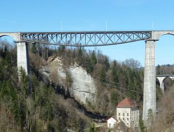 Der nach unten gerichtete Halbparabelträger der Sitterbrücke der Bodensee-Toggenburgbahn ist mit 120 m Länge der längste Einfeldträger im Schweizer Bahnnetz. |